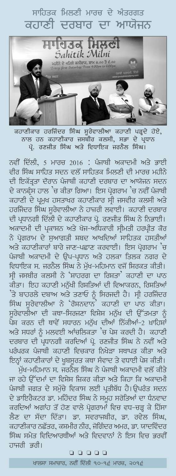 March 5, 2016, Kahani Darbar- Kahanikars: Sh. Jasbir Kalsi & Sh. Harjinder Singh Surewalia, Chief Guest: S. Jarnail Singh, presided over by Prof. Ranjit Singh. Report>>