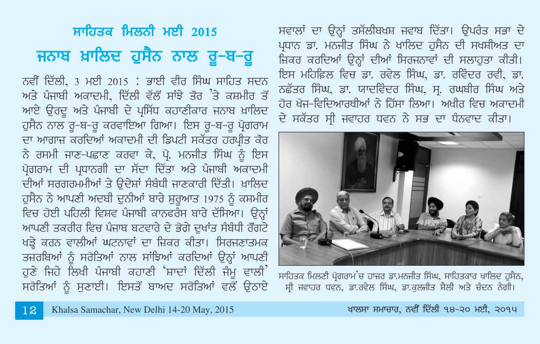 May 2, 2015, Ru-b-Ru with Khalid Hussain : Chair: Prof. Manjit Singh. Report>>