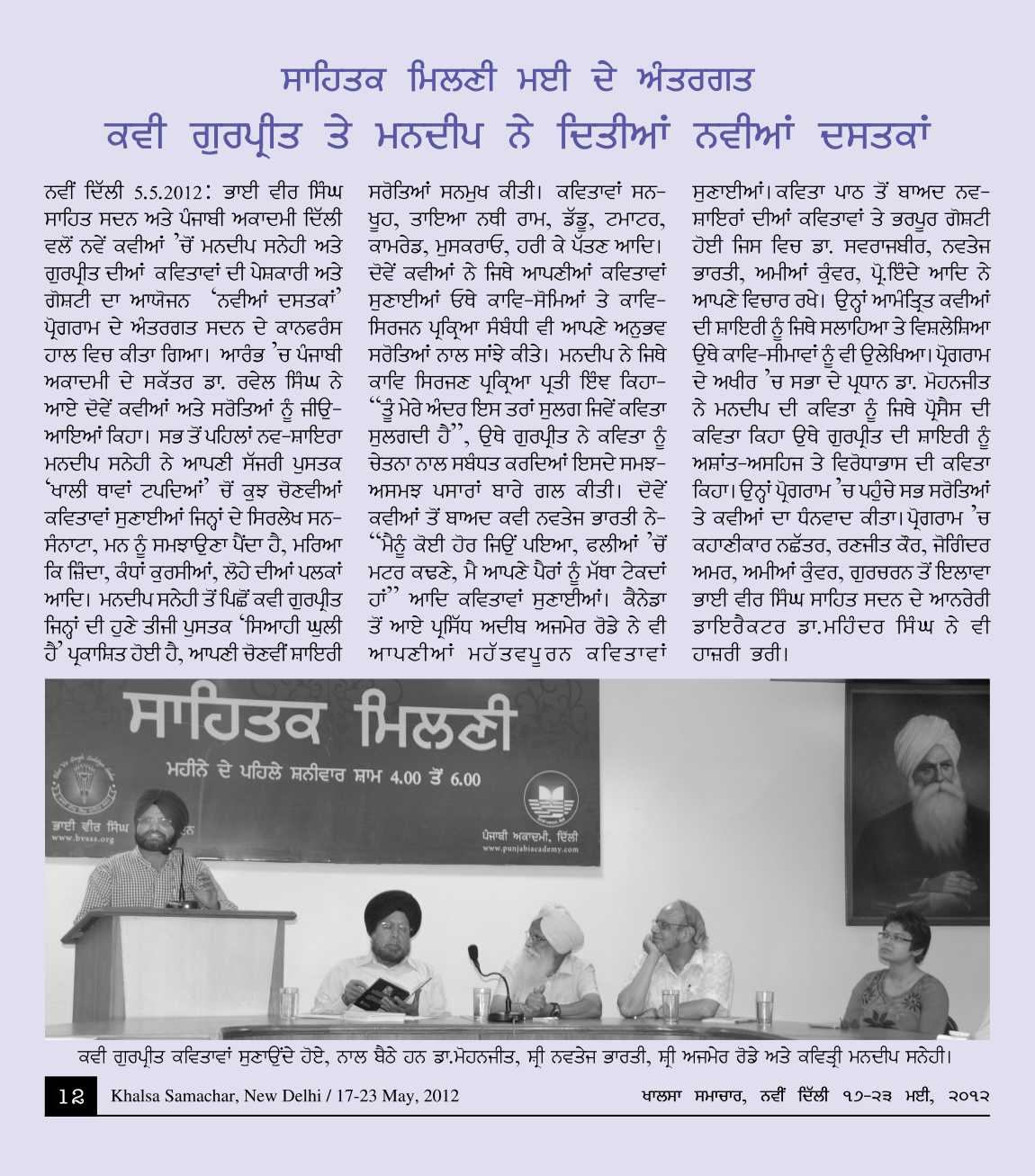 May 5, 2012, Naviyan Dastkaan : Invited Poets; Shri Gurpreet, Smt. Mandeep Sanehi. presided by Dr. Mohanjit. Report>>