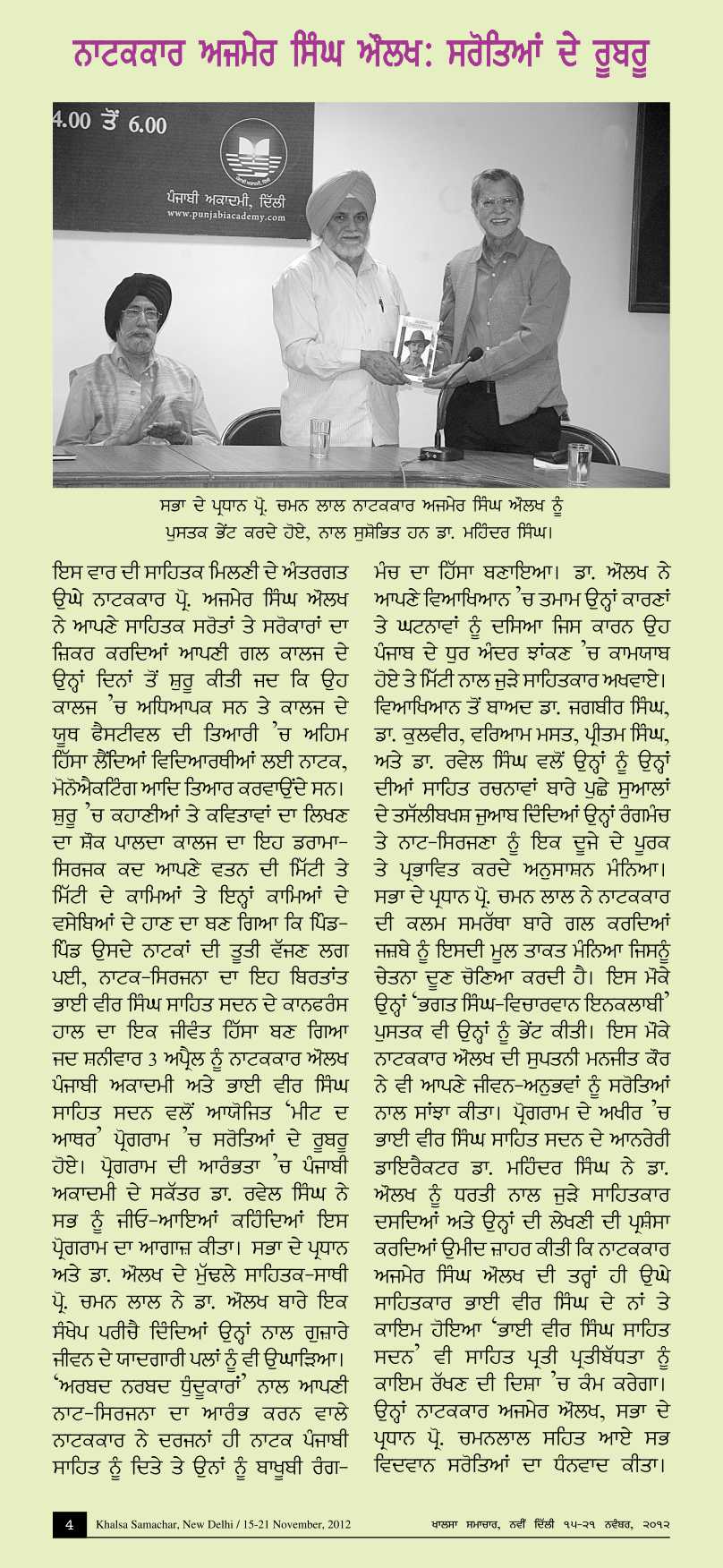 Novermber 3, 2012, Meet the Author with dramatist Ajmar Singh Aulakh : presided over by Prof. Chaman Lal. Report>>