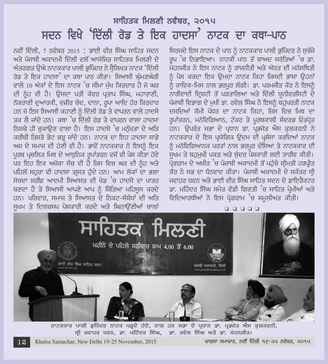 November 7, 2015, Reading of New Play "DELHI ROAD TE IK HAADSA" by Pali Bhupinder. Report>>