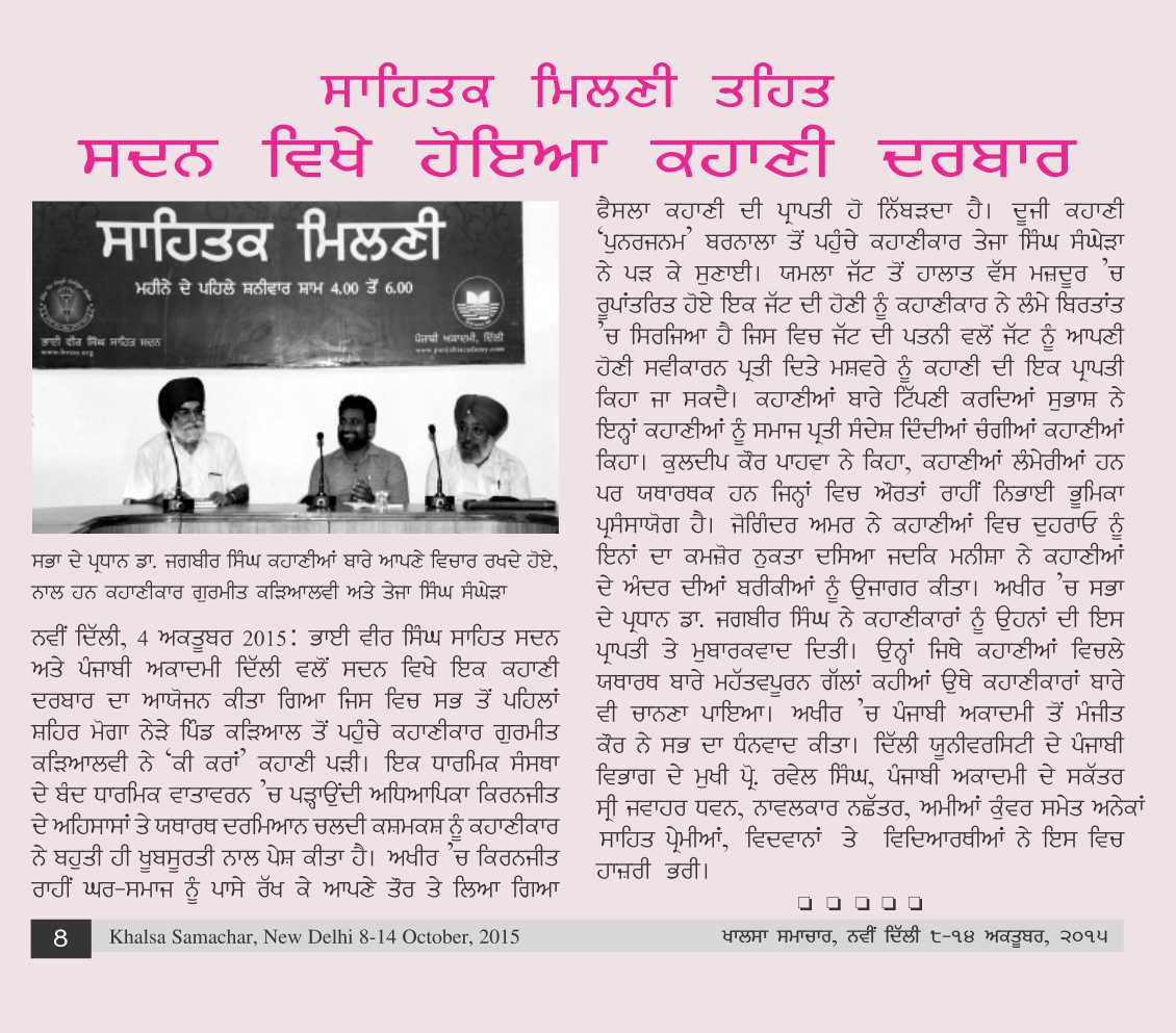 October 4, 2015, Kahani Darbar : Chair: Dr. Jagbir, Kahanikars: Sh. Gurmeet Karyalvi & Sh. Bhola Singh Sanghera. Report>>