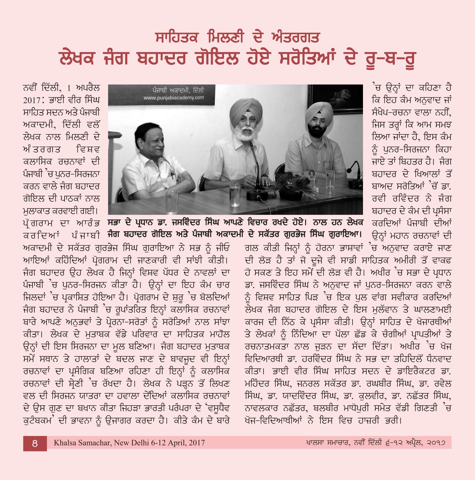 April 1, 2017 Ru-b-Ru with Jung Bahadur Goyal, Presided over by Dr. Jasvinder Singh at Bhai Vir Singh Sahitya Sadan, New Delhi. >>Report