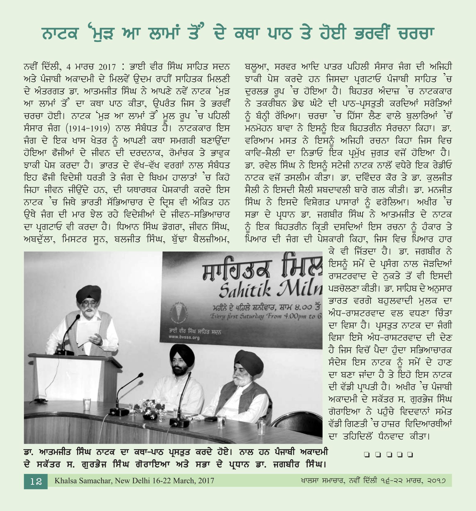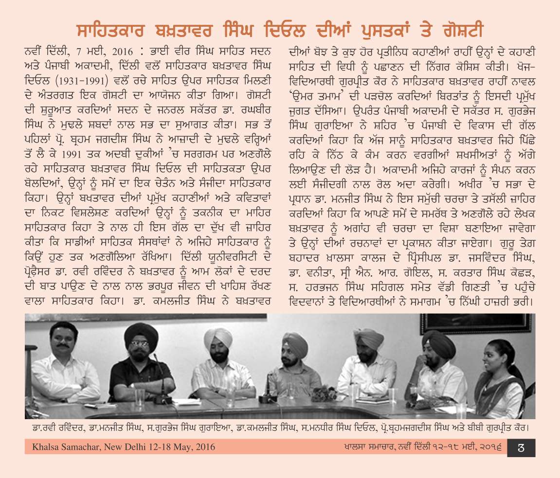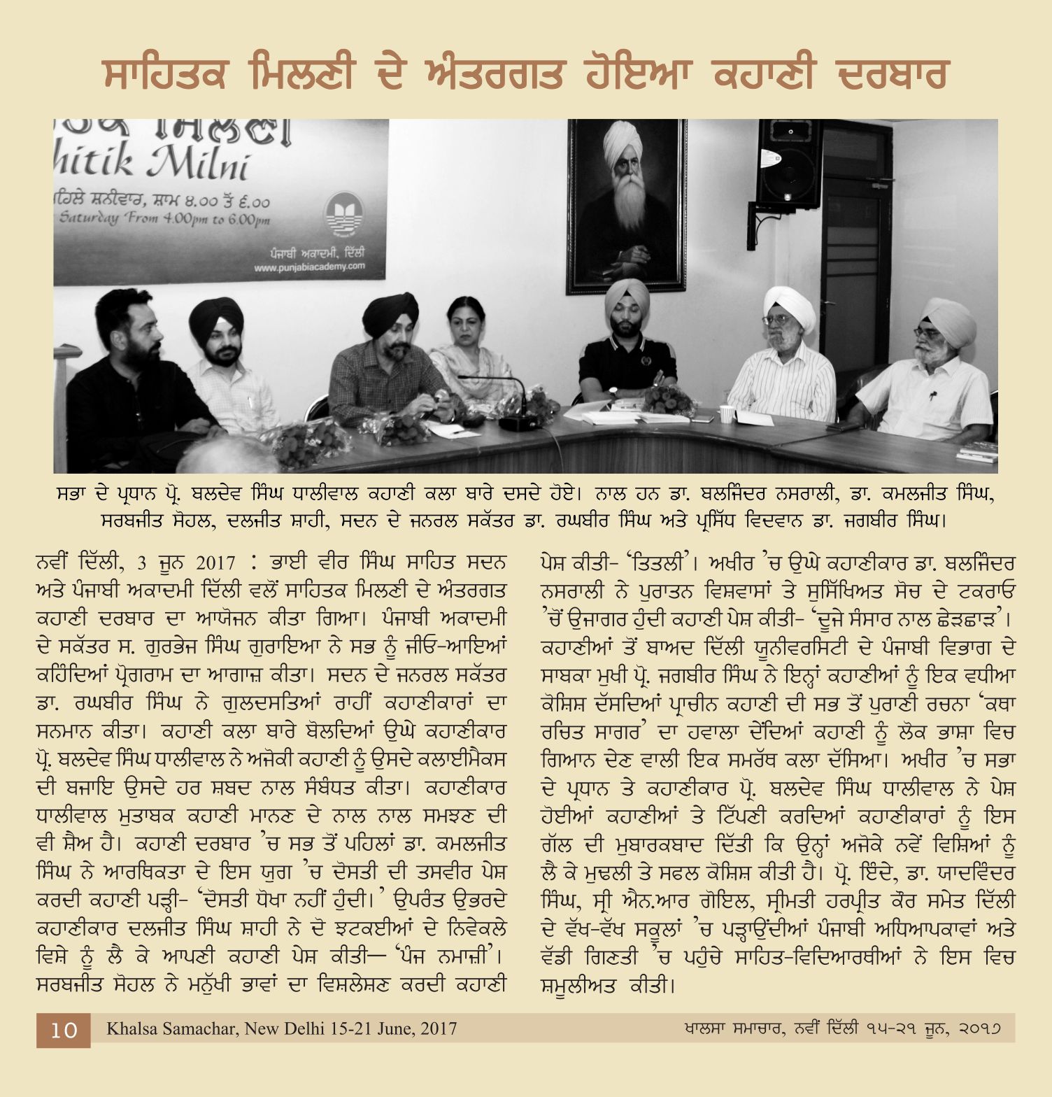 June 3, 2017 Kahani Darbar : Story writers: Dr. Baljinder Nasrali, Dr. Sarbjit Kaur Sohal, Dr. Kamal Jit Singh, S. Daljit Singh Shahi, Presided by Dr. Baldev Singh Dhaliwal at Bhai Vir Singh Sahitya Sadan, New Delhi. >>Report