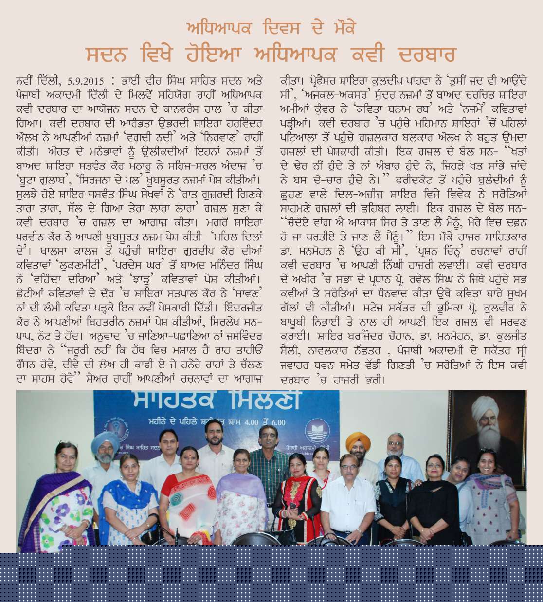 September 5, 2015, Teacher's Kavi Darbar : Chair: Dr. Rawail Singh, Compere: Dr. Kulvir, Poets: Vijay Vivek, Kuldeep Pahwa, Amia Kunwar, Satpal Kaur, Jasvinder Kaur Bindra, Inderjit Kaur, Gurdip Kaur, Maninder Singh, Balkar Aulkh, Jaswant Singh Sekhwan, Praveen Kaur, Satwant Matharu, Harvinder Aulakh, Mohan Tyagi. Report>>